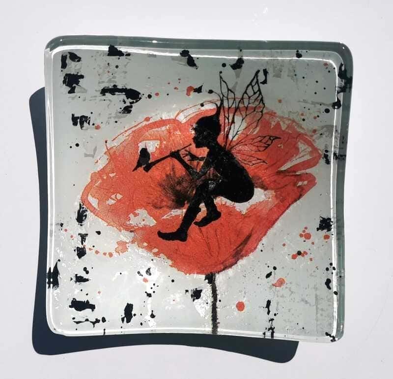 Imagine une fée déposée sur un coquelicot, une main tendue vers un oiseau,